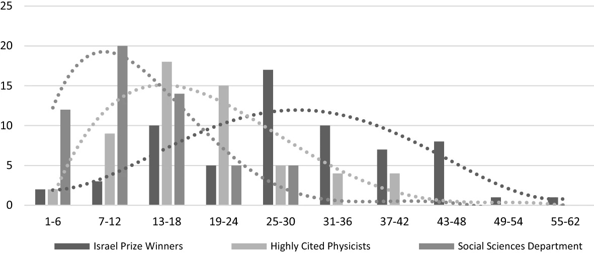 In any case, it turns out that the miracle year goes far beyond this trinity of science. Yair and Goldstein (2020) show the existence of miracle years in the careers of Israeli ‘star scientists’, highly-cited physicists, and economists in an elite American departments. Their sample sizes are admittedly small, but so are the number of great scientists, and their results are consistent. They conclude: