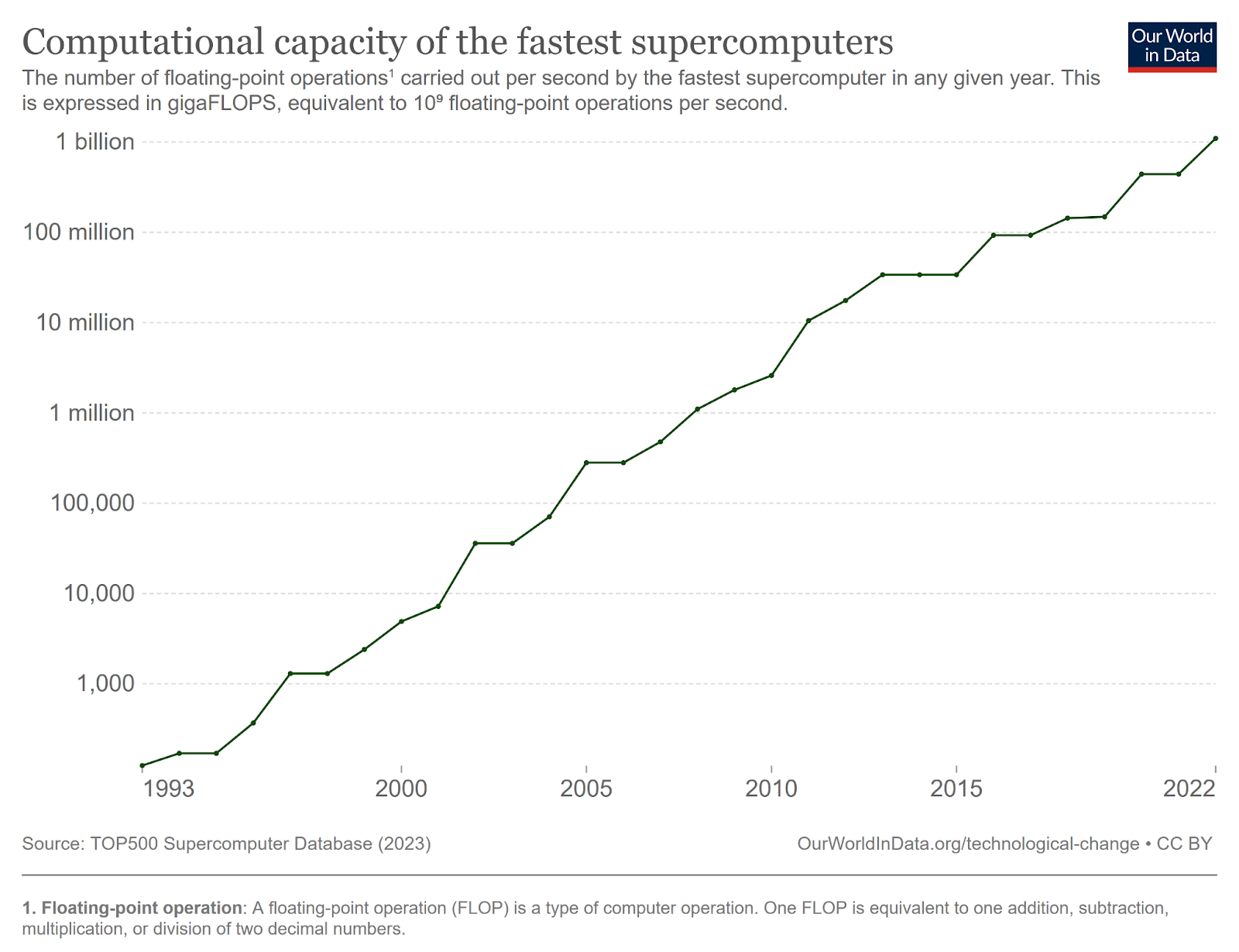 The extra computational power let us not only realize Richardson’s fantasy, but also increase the resolution of our forecasts, incorporate more observations, and improve our models, eventually increasing our ability to predict into the future.[15] You probably know that supercomputing capacity has increased exponentially over time for the last few decades (note the logarithmic scale):