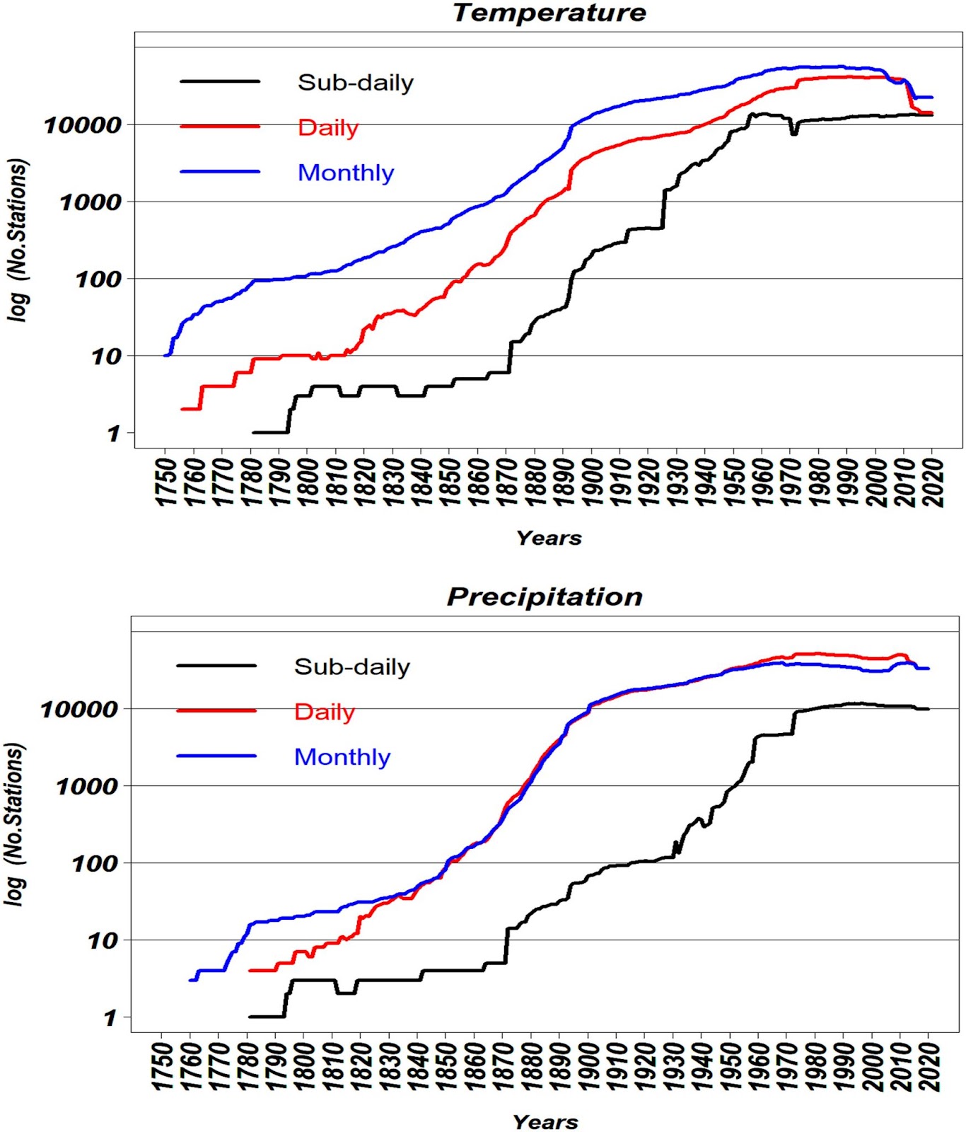 To give you a sense of how the quantity of observations changed over time, look at the number of land-based station over time[9] from the Copernicus Climate Change Service: