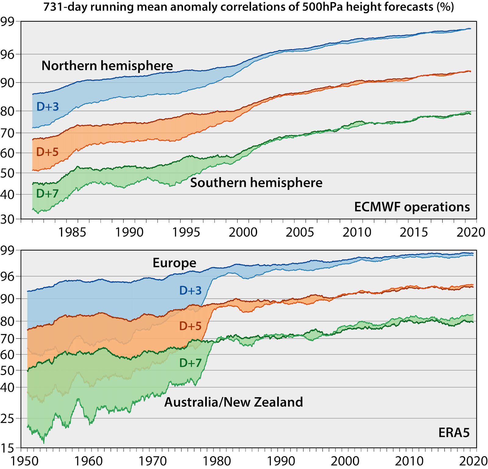The evolution of forecast skill over time in different regions. D+3 means three days into the future, D+5 means five days into the future, and so on. Note that the vertical axis is a measure of forecasting skill (beware: the axis isn’t linear, but some funky broken scale). In this case, the skill has to do with predicting a certain pressure level, which affects the weather. The bottom panel has data for a longer time range.