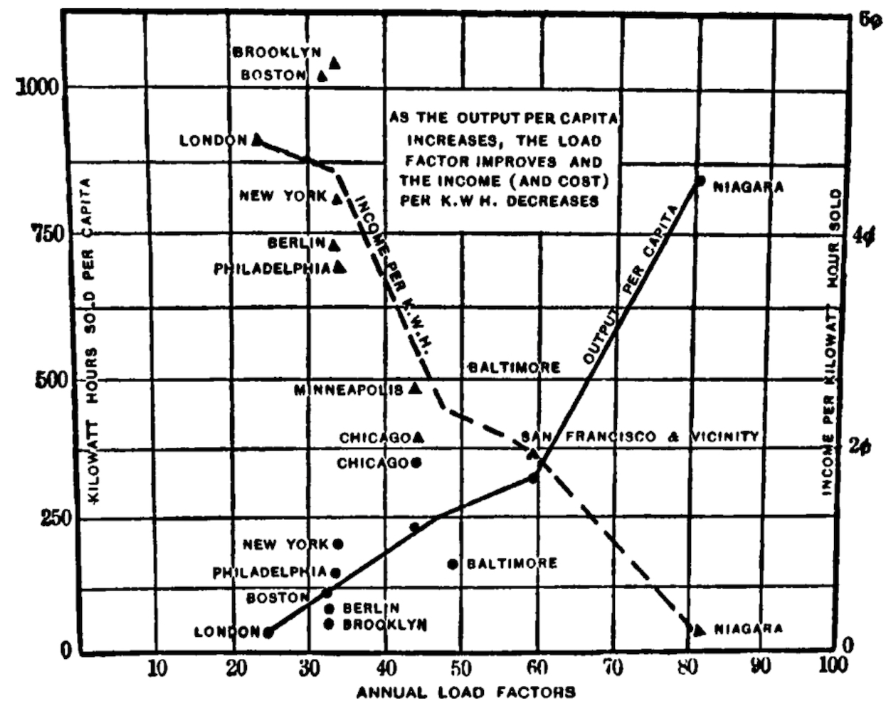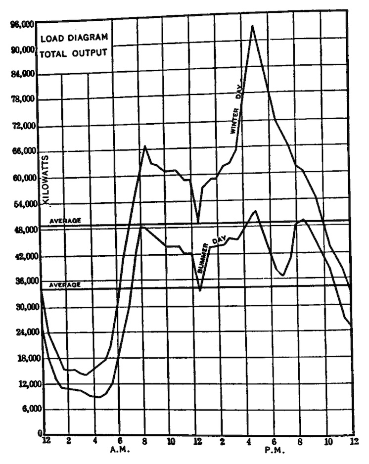 The book also mentions very briefly that chemical plants made great electric customers because their “nearly labor-free processes” could be done 24 hours a day; and that “home appliances such as irons, fans, vacuum cleaners, refrigerators, and, later, air conditioners” helped manage load, although it’s not clear to me how.
