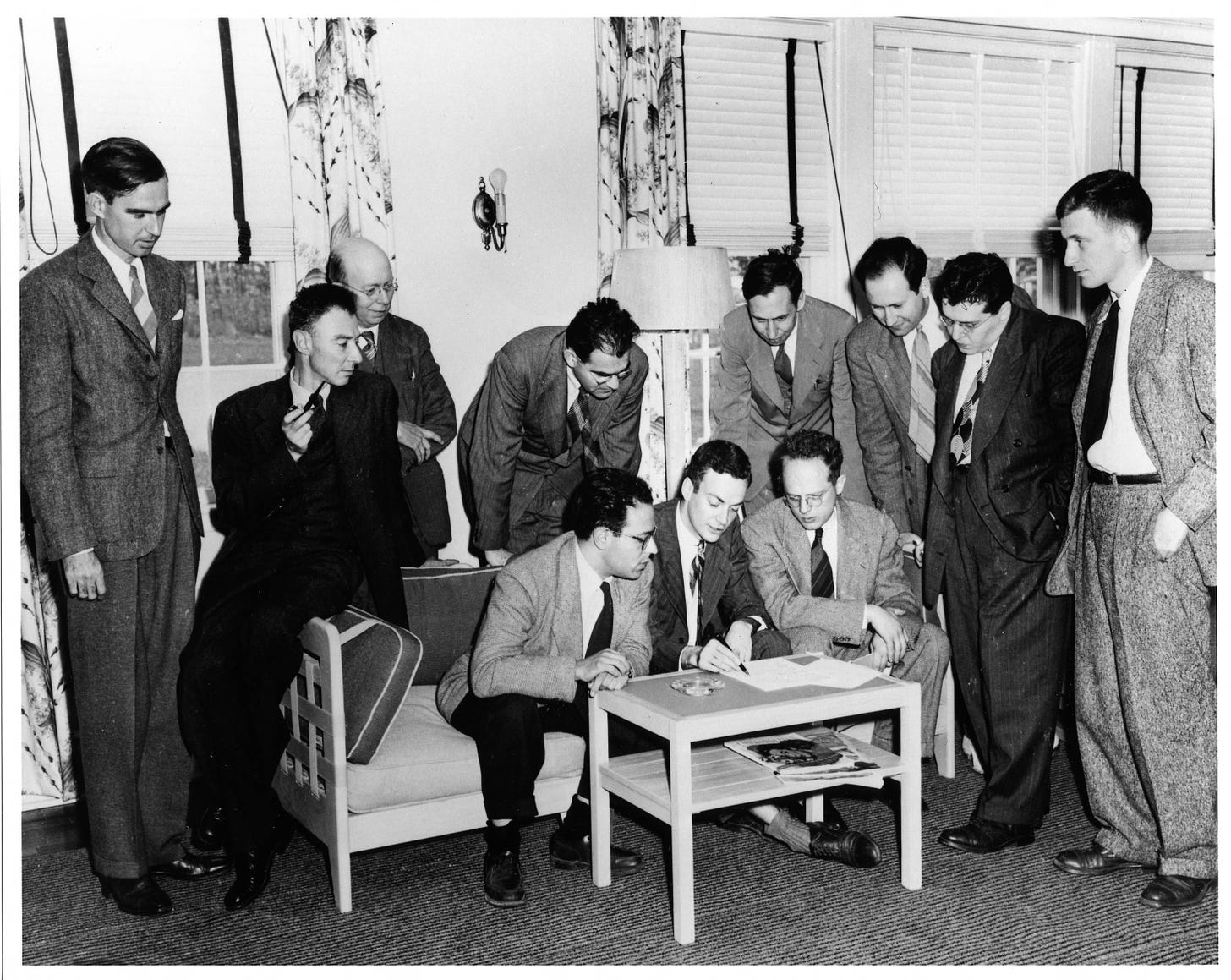 First Shelter Island Conference, 1947. From left to right, I.I. Rabi, Pauling, J. Van Vleck, W.E. Lamb, Gregory Breit, Duncan MacInnes, Karl Darrow, G.E. Uhlenbeck, Julian Schwinger, Edward Teller, Bruno Rossi, Arnold Nordsieck, John von Neumann, J.A. Wheeler, Hans Bethe, R. Serber, R.E. Marshak, Abraham Pais, J. Robert Oppenheimer, David Bohm, Richard Feynman, Victor F. Weisskopf, Herman Feshbach