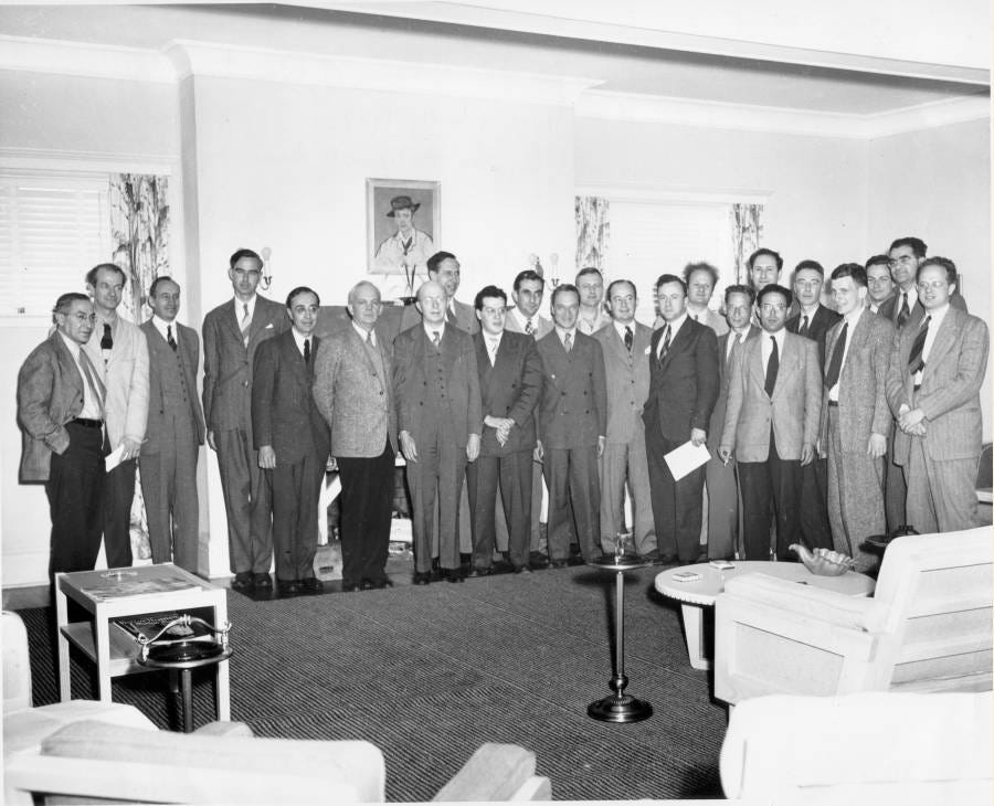 First Shelter Island Conference, 1947. From left to right, I.I. Rabi, Pauling, J. Van Vleck, W.E. Lamb, Gregory Breit, Duncan MacInnes, Karl Darrow, G.E. Uhlenbeck, Julian Schwinger, Edward Teller, Bruno Rossi, Arnold Nordsieck, John von Neumann, J.A. Wheeler, Hans Bethe, R. Serber, R.E. Marshak, Abraham Pais, J. Robert Oppenheimer, David Bohm, Richard Feynman, Victor F. Weisskopf, Herman Feshbach
