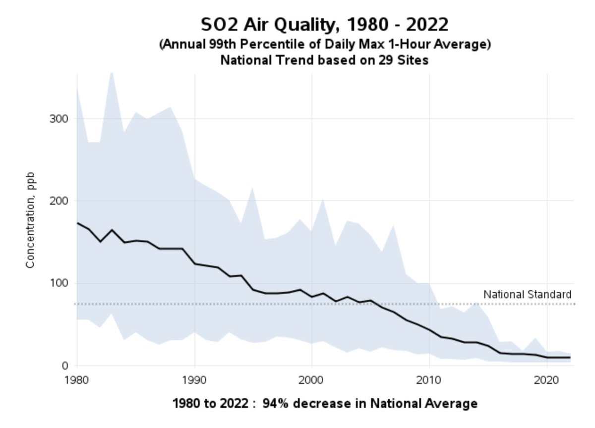 “Good news of the day: We’ve reduced sulfur dioxide pollution by 94% over the last 40 years (and mostly solved the acid rain problem)” (@AlecStapp)