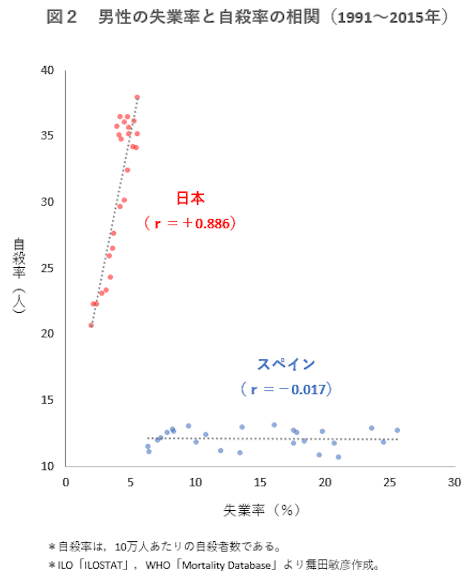 “One society where the suicide rate is highly correlated with the unemployment rate (Japan, red), and one society where it is not at all correlated (Spain, blue)” (@nick_kapur)