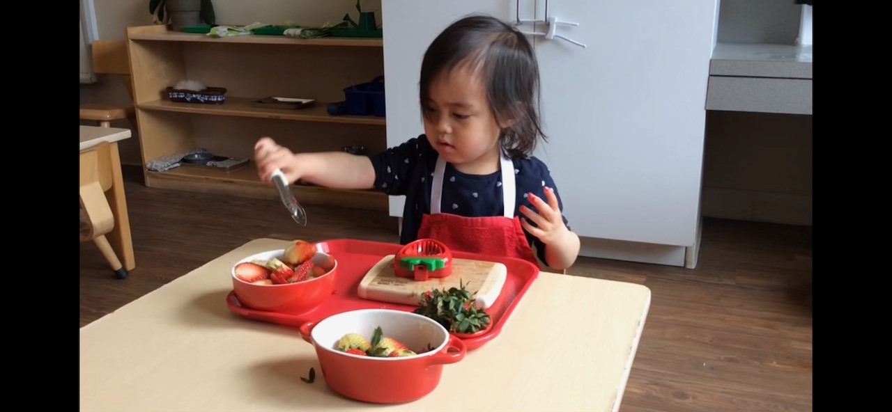 A little while ago, one of my friends shared a video on Facebook. It shows her toddler daughter carefully cutting a strawberry to share as a snack with her friends in her Montessori preschool classroom. Her face is focused. She’s in the moment. Her whole little being concentrates on mastering this task. The setting is beautiful: There are child-sized tools that make this task possible for her; she’s wearing an apron in the same red as the tray and the porcelain bowls; and there are the strawberries, red, ripe, ready to be eaten.