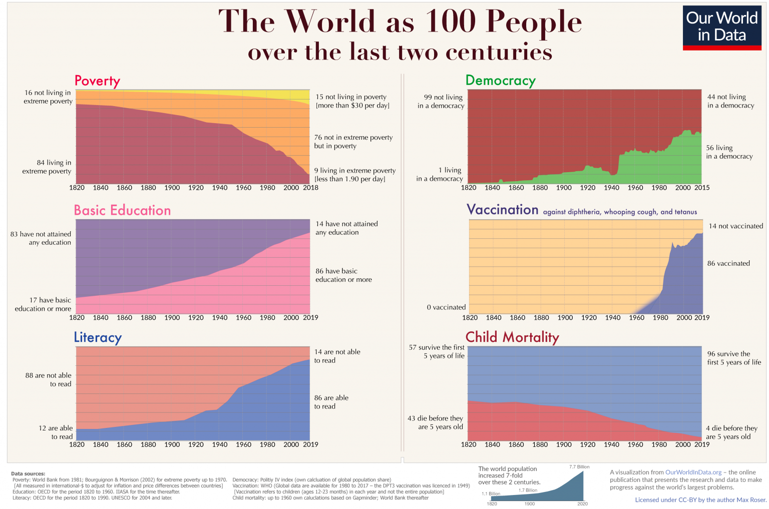 Creating the abundance we take for granted today—of which fresh produce in grocery stores is just a small sliver—is, I think, humanity’s greatest achievement. This transformation has rightly been called the Great Enrichment: For millennia, humans everywhere lived in poverty and died at a young age. And then things changed rapidly for the better, on a global scale, as illustrated so compellingly in the history of global living conditions at Our World In Data.