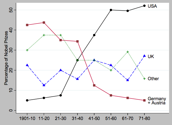 Promising young math, physics, and chemistry graduate students from the US like Robert Oppenheimer and Karl Compton would never again go to Germany to learn from the best in the world. American academia now held that crown, in no small part due to the wartime European emigrés. You can clearly see this trend play out in the following graph of Nobel Prize frequency by country.