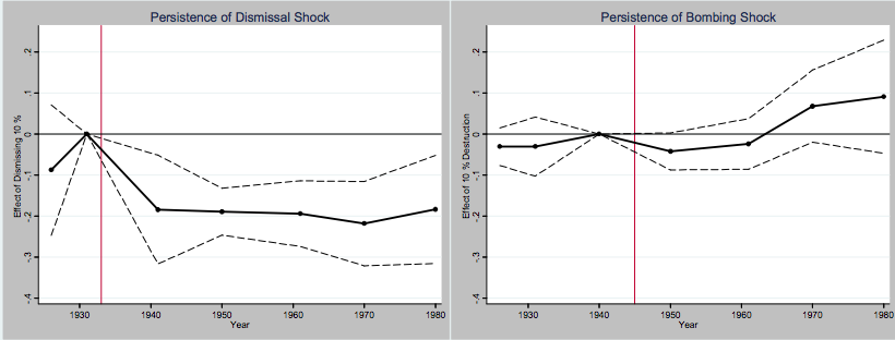 Below, you can see the persistent effects of the dismissals compared to the exact opposite long-run effects in the case of the bombing shock.