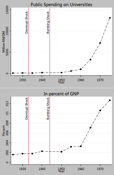 Now, getting your academic building partially blown to shreds is obviously bad for departmental productivity. But, so is having up to 15% of your professors fired for something as arbitrary as having a Jewish grandparent or attending a communist party meeting. And, while it’s obvious that both of these will at least temporarily decrease departmental output, it is not clear at all which is worse, either in the short run or in the long run.