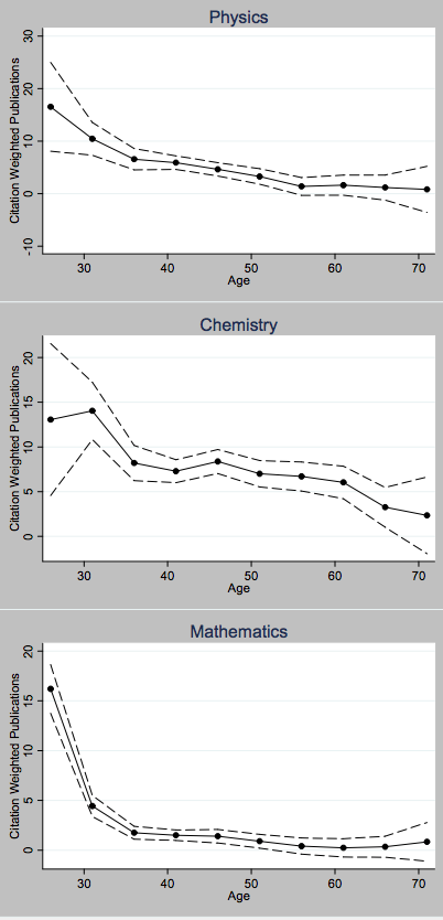 The following graphic, showing the average citation weighted publications for the three fields by age from Waldinger’s data, demonstrates that the mathematicians were right to be afraid. While the average physicist and chemist seem to be at least half as productive at the age of 40 as they were at their peak, mathematicians are borderline useless by 40. They only seemed to be about 1/8th as productive at that point.