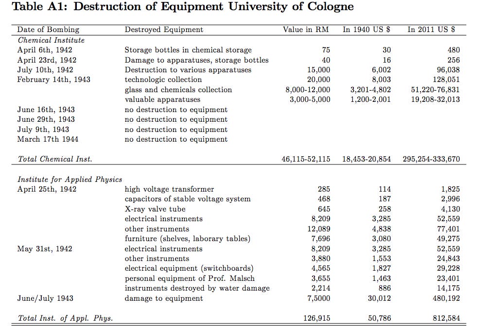 The following table shows the total damage claims for the University of Cologne’s modestly sized Chemical Institute and Institute of Applied Physics which were severely damaged in an RAF raid. The TOTAL DAMAGES to the Chemical Institute were only $300,000 in 2011 dollars. And the damages to the Institute of Applied Physics were only a shade over $800,000, in 2011 dollars.