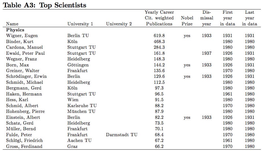 But...my god was that small group of professors talent-dense. Take a look at the table below where Waldinger lists out some of the most cited scientists in the data. Eugene Wigner, Max Born, Erwin Schrödinger, and Albert Einstein were all active researchers in this period. Those four scientists that I just listed, not just Nobel Prize winners but all-time greats amongst Nobel Prize winners, were more than 1% of Germany’s physicists at the time!