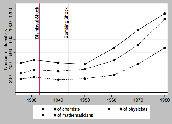 Waldinger, at one point, separated the data by discipline to see whether the physical capital shocks had differing effects across disciplines. For example, one might expect a physical capital shock to be far more devastating to a chemist who is dependent on lab work than a mathematician who can simply use chalk and a blackboard.