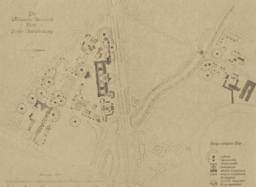 Bombing destruction at the Technical University of Berlin. (Circles indicate individual bombing impacts. Small triangles indicate destruction from artillery. Completely burned out buildings are shaded dark grey. Partially burned out buildings are shaded light grey. Destroyed roof structures are shaded with little dots. Crashed planes are marked by a plane symbol.)