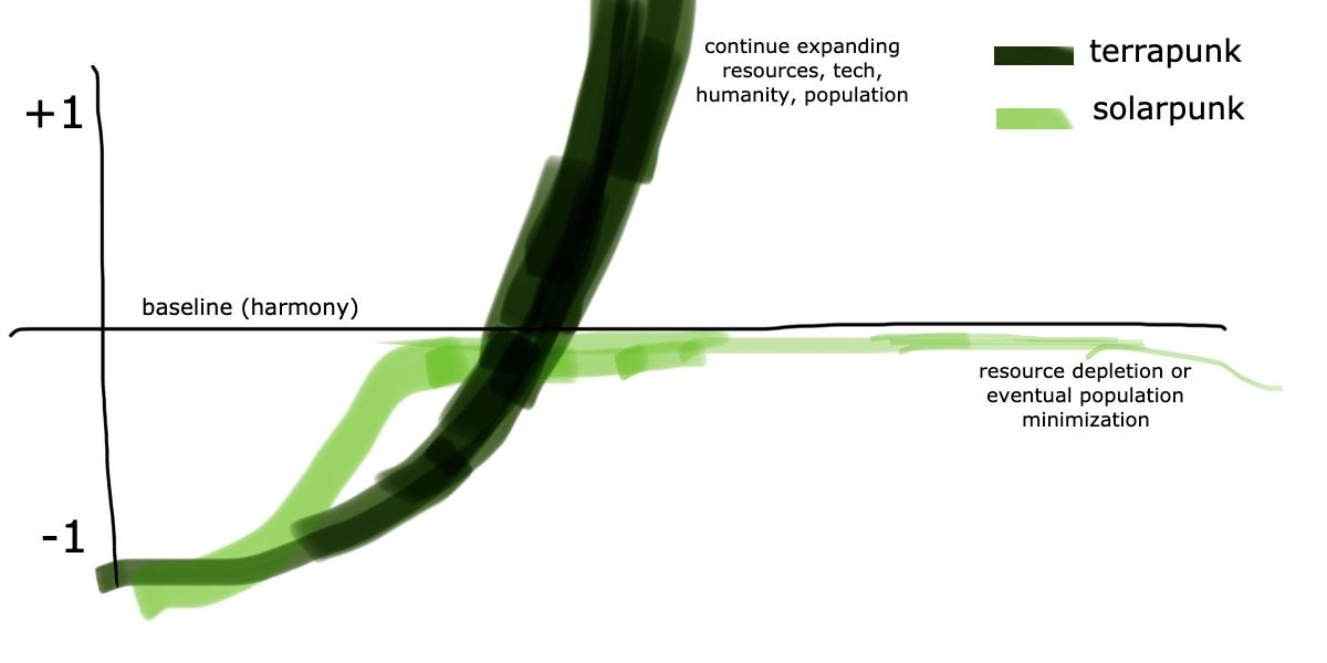 I have never heard the terms human maximization, population expansion, or resource creation in solarpunk—and they are not once mentioned in the original conception. For to live in harmony with the earth is to imply a reduction of growth and resource usage. Even if successful, there is always the sense that climate change is right around the corner, and if one were to use fossil fuels, the whole ecosystem would collapse. Have you ever seen any rocket launches depicted in solarpunk? One might say “but we are happy on earth, we have everything we need!”.