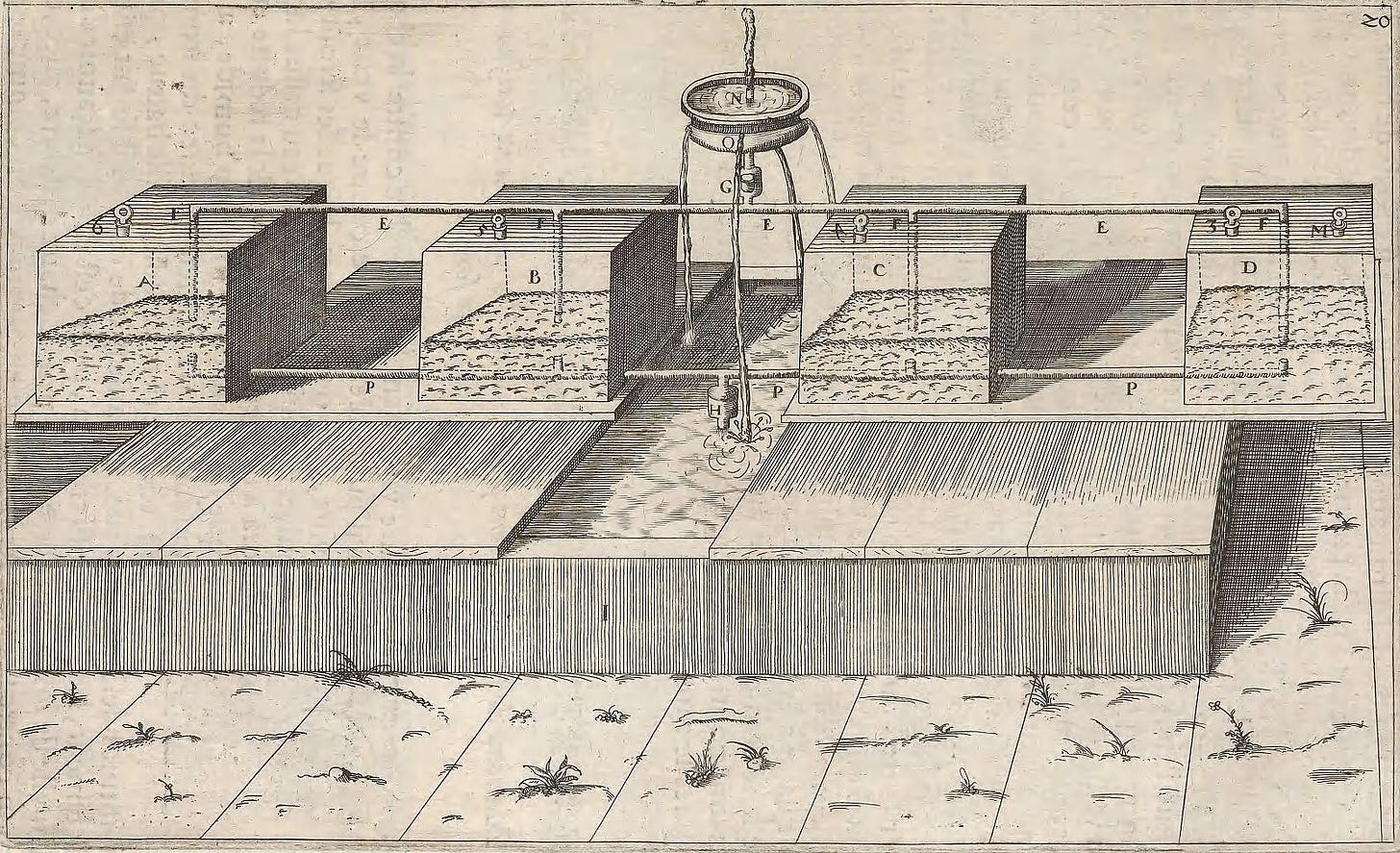 In this basic version de Caus has four copper vessels with some water in them, and connected through their bottoms with pipe (P). A valve (H) allows them to draw up water from a cistern below, without that water falling back down. And another pipe (F) goes into the water in each of the vessels, so that water can be pushed up through another valve into a fountain. The way it works is deceivingly simple. When the hot midday sun warms the vessels — de Caus mentions this will work best in a warm country like Italy or Spain — the air and water will heat up in the vessels, forcing the water up to make the fountain flow.