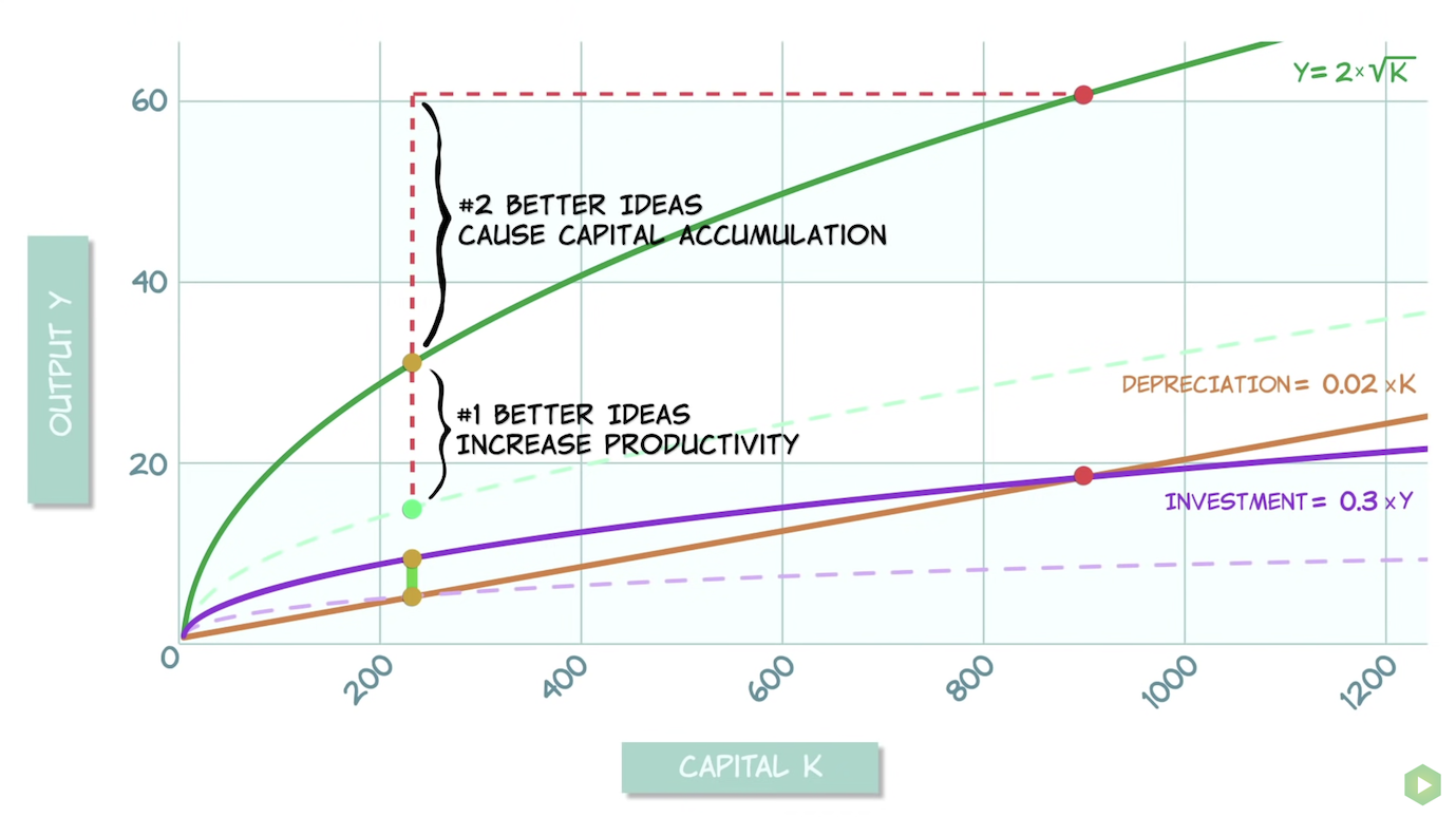 In the 20th century, the crucial role of ideas was confirmed by formal economic models. The economist Robert Solow was studying how output per worker increases as we accumulate capital, such as machines and factories. There are diminishing returns to capital accumulation alone. A single worker who is given two machines can’t be twice as productive. So if technology is static, output per worker soon stops growing: