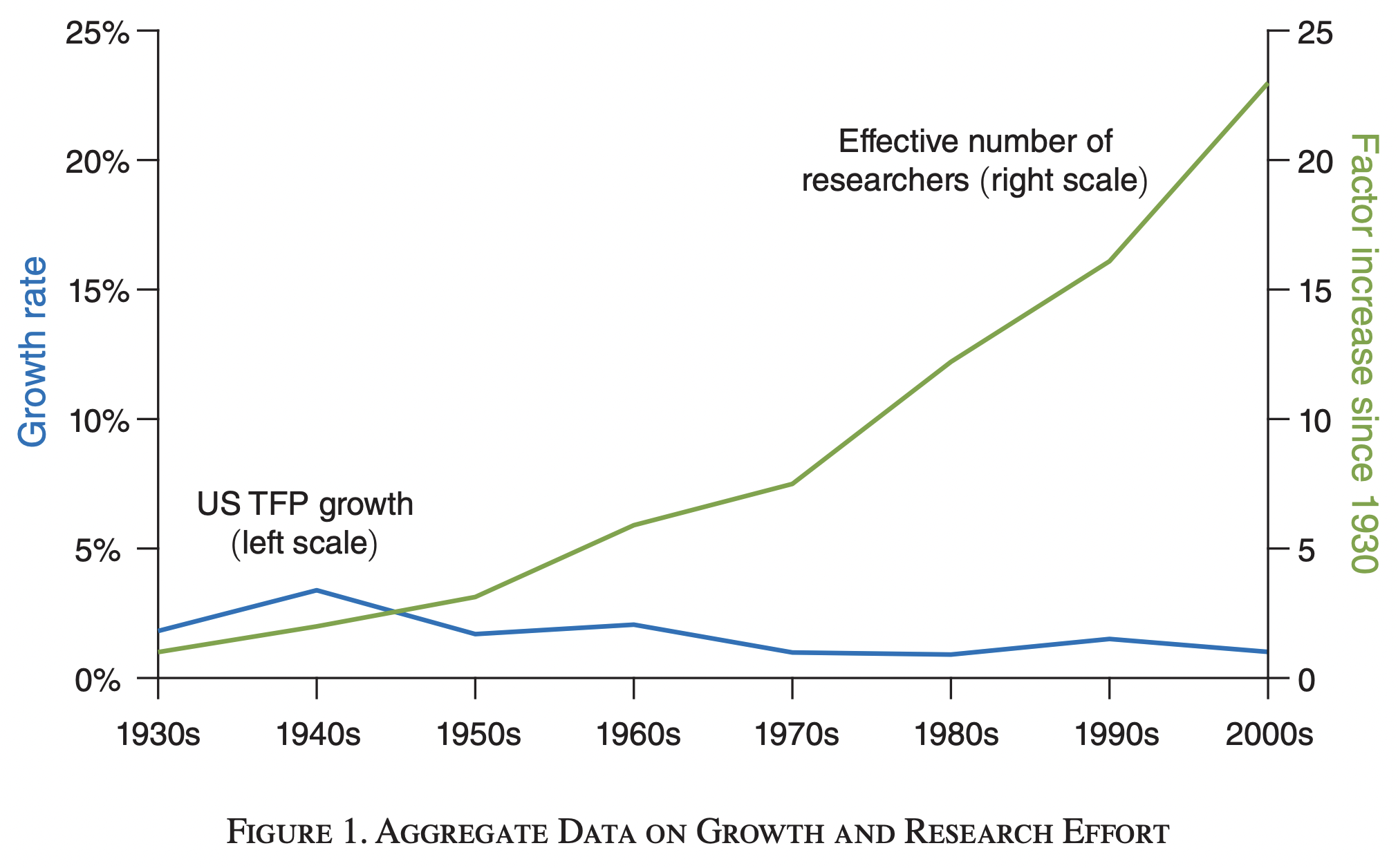Romer assumed that the technology multiplier would grow exponentially at a rate proportional to the number of researchers. But another economist, Chad Jones, pointed out that in the 20th century, we have vastly increased R&D, while growth rates have been flat or even declining. This is evidence that ideas have been getting harder to find: