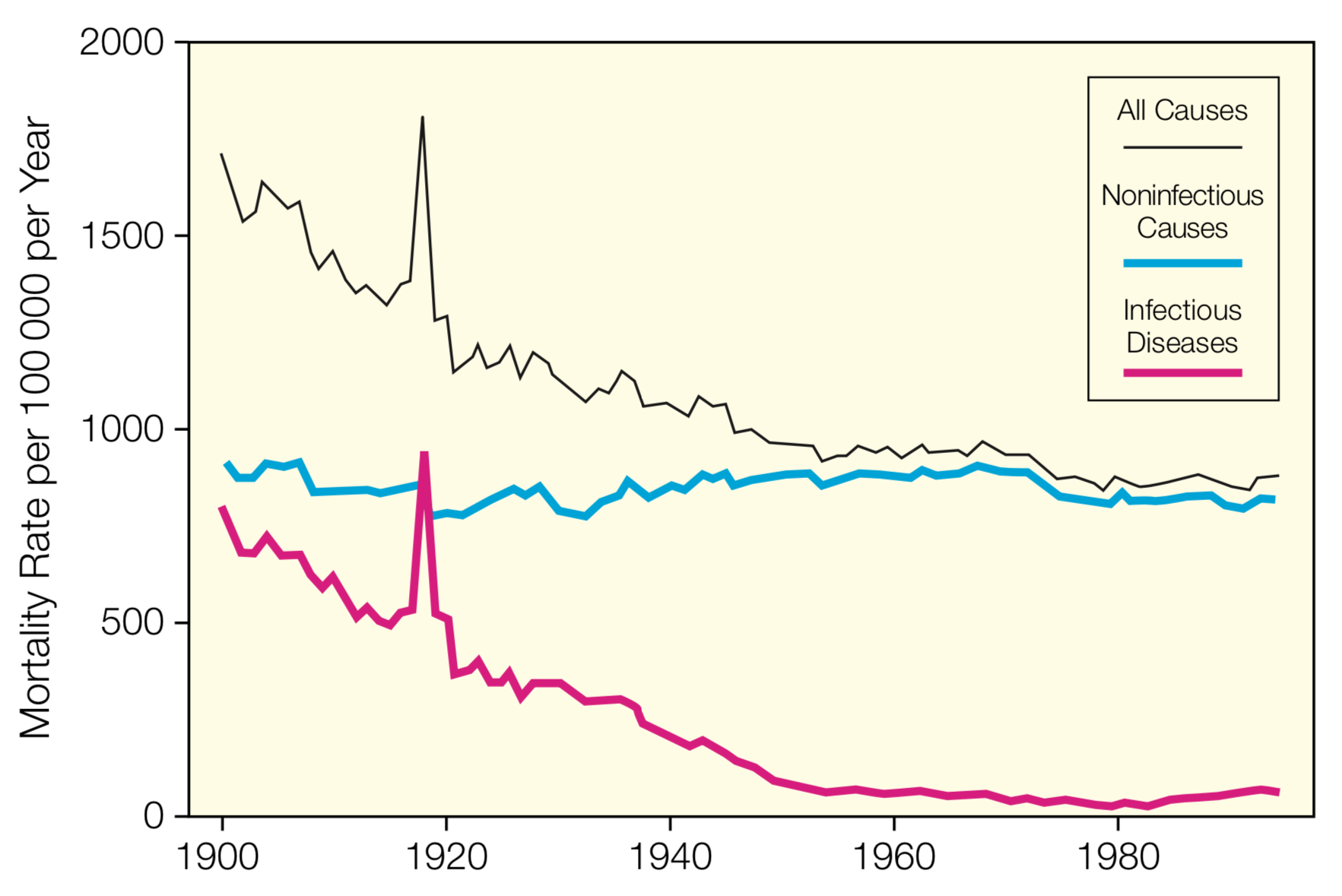 Overall mortality from infectious disease reduced by 90% in the 20th century alone
