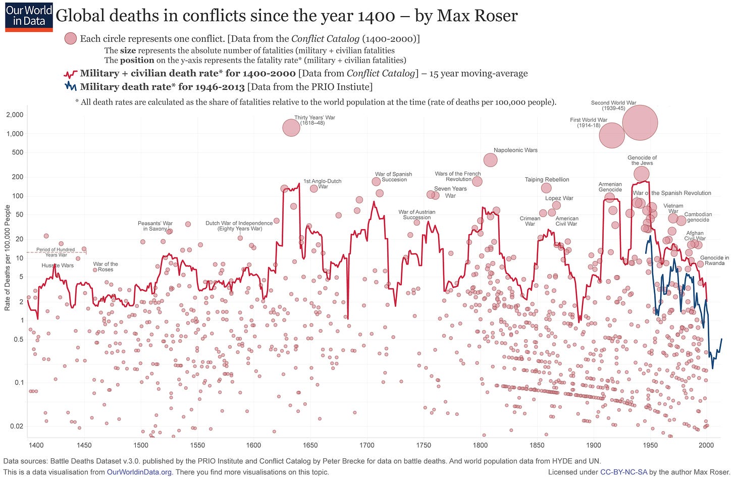 The stability of the offense-defense balance isn’t specific to cybersecurity. The graph below shows the per capita rate of death in war from 1400 to 2013. This graph contains all of humanity’s major technological revolutions. There is lots of variance from year to year but almost zero long run trend.