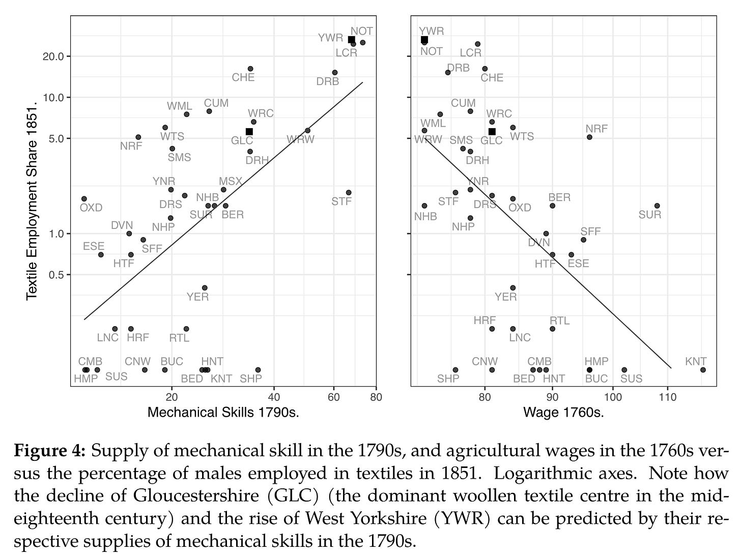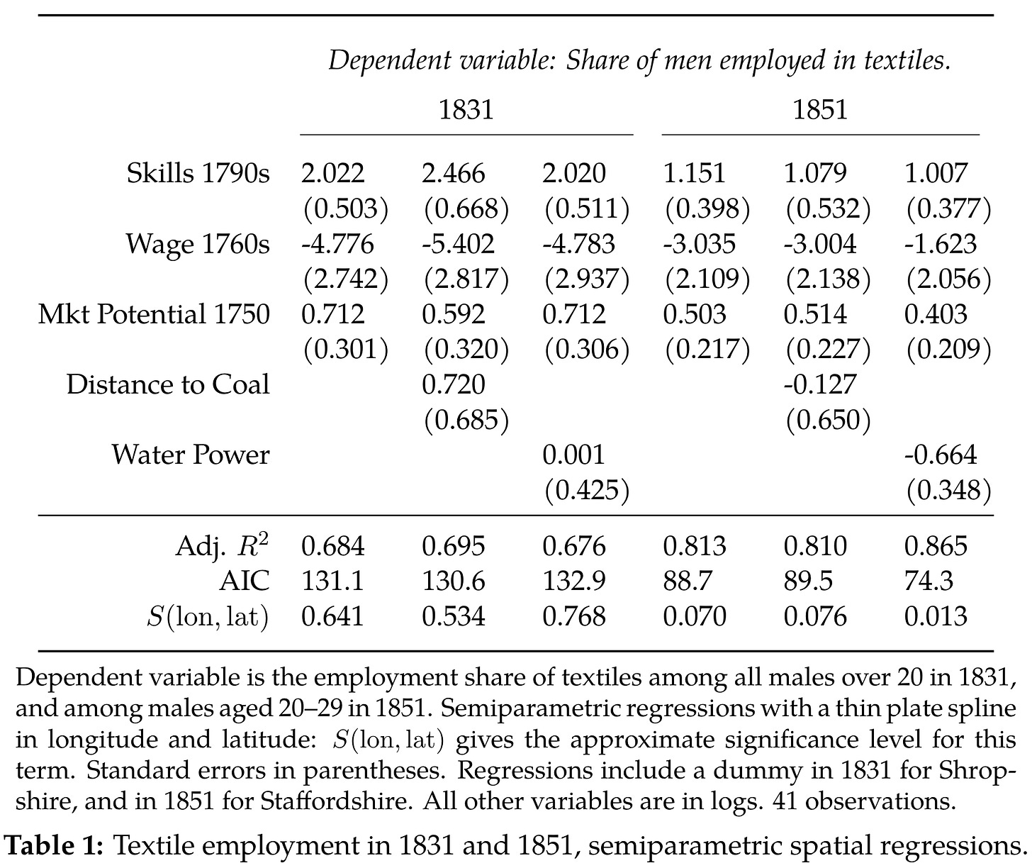 So far, so good, but it’s still just anecdote. To prove this, the authors try to show that the pattern of textile and metallurgical concentration across Britain was determined by pre-existing clusters of skilled labor. The problem here is, unsurprisingly, that adequate statistics neither for “skilled people” nor “innovative industry” really exist for the eighteenth century on a sufficiently disaggregated scale. The first census was taken in 1801, and the authors have data for textile employment at the county-level starting in 1831. They also have wages in 1760. To measure “skills,” they have to adapt: they count “blacksmiths, millwrights (both traditional skills), watch- and instrument makers, gunsmiths and locksmiths, toolmakers, sheet-metal workers, and mechanics” above the age of 60 in the 1851 census. These men would presumably have been apprenticed at age 14 in the 1790s, and their sum proxies for the availability of skill in that decade. This is the key explanatory variable: the authors regress 1831⁄51 textile employment on “1790 skills,” controlling for water flow (proxying for water mill suitability), coal proximity, and market potential.3