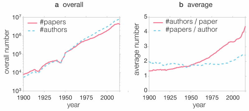 At left, we can see the number of papers and authors per year has increased basically in lockstep over the twentieth century. Note, the axis is a log-scale, so that a straight-line indicates exponential growth. Meanwhile, at right, the blue dashed line shows that the number of papers per author has hovered around 2 for a century and rather than falling, it is actually on the rise in recent decades. (As an aside, the solid red line at right is strong evidence for the rise of teams in science, discussed more here)