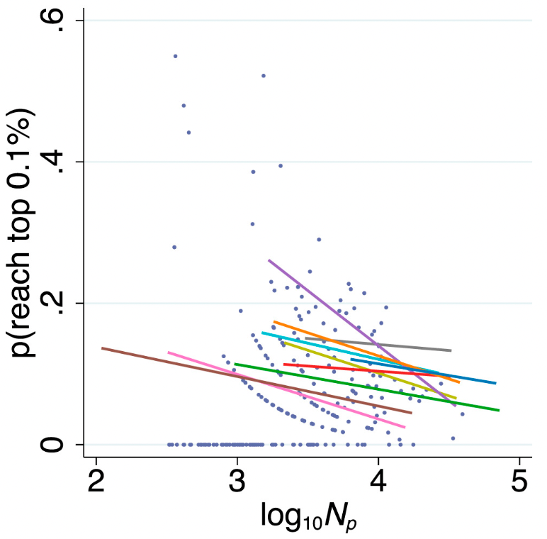 Probability of ever being a top 0.1% most cited paper, agains size of field