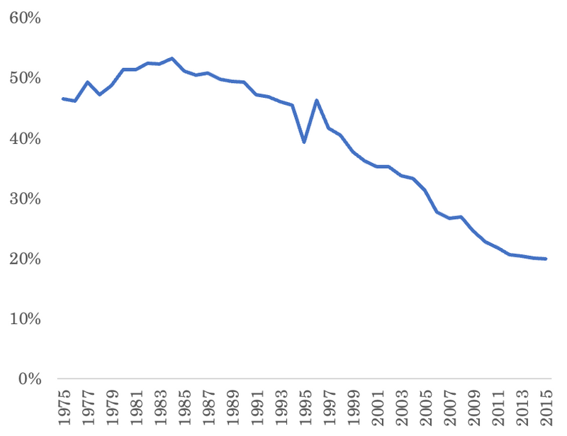 I have not been able to find any papers that look at the extent to which patents cite recent academic research (if you know of such work, please send it my way and I can update this). Fortunately, Marx and Fuegi have a publicly available database of patent citations to academic work, which I used to put together the following figure. In each year of the following figure, I pull all citations made to academic papers by US patents whose application was filed in that year, and that was eventually granted within the next five years. I then compute the share of these citations that go to papers published in the preceding five years. Essentially, this is the Price index, discussed in the previous section, but applied to the citations of patents. I started the figure in 1975, as citations to academic papers were quite rare before then.