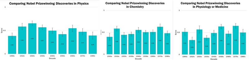 So recent discoveries seem to have a harder time getting recognized as Nobel-worthy, relative to a few decades ago. We can also compare the importance of different discoveries that won Nobel prizes. In 2018, Patrick Collison and Michael Nielsen asked physicists, chemists, and life scientists to pick the more important discovery (in their field) from sets of two Nobel prize winning discoveries. For example, they might ask a physicist to say which is more important, the discovery of Giant Magnetoresistance (awarded the Nobel in 2007) or the discovery of the Compton effect (awarded in 1927). For each decade, they look at the probability a randomly selected discovery made in that decade would be picked by their survey respondents over a randomly selected discovery made in another decade. The results are below:[1]