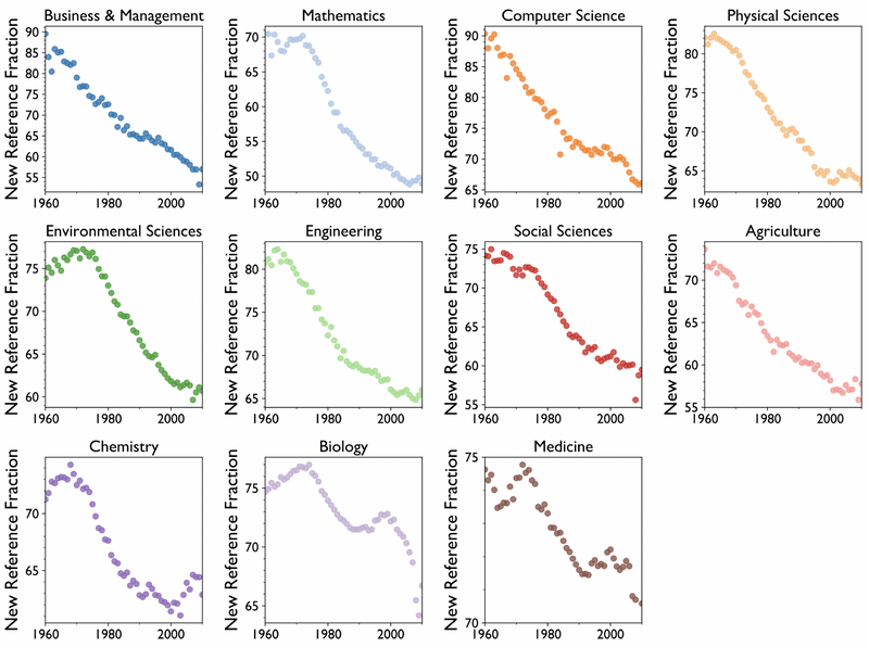 Cui, Wu, and Evans (2022) document that this trend has continued until 2014, and is not driven by any single field. It appears to be an almost universal phenomenon. In the figure below, they calculate the share of (all) citations made to work published in the preceding 10 years. It’s down across the board.