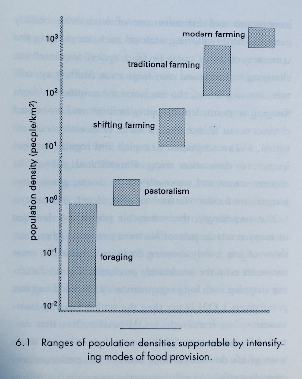 A classic I just discovered is Ester Boserup, The Conditions of Agricultural Growth: The Economics of Agrarian Change Under Population Pressure (1965). Primitive agricultural systems are profligate with land: slash-and-burn agriculture uses a field for a couple of years, then leaves it fallow for decades; in total it requires a large land area per person. Modern, intensive agriculture gets much higher yields from the land and crops it every single year. And there is a whole spectrum of systems in between.