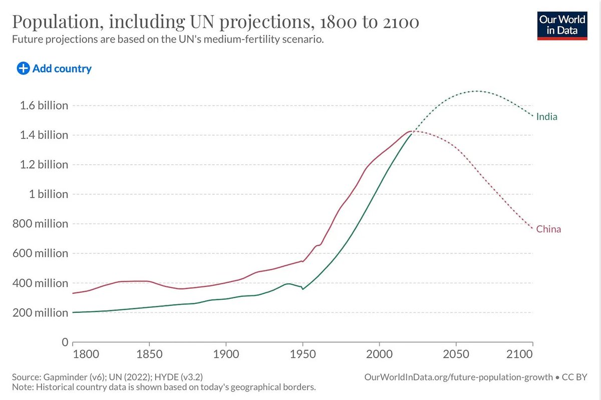 China will depopulate over the next 40 years, while India will add the same number of people as China loses (Shruti Rajagopalan)