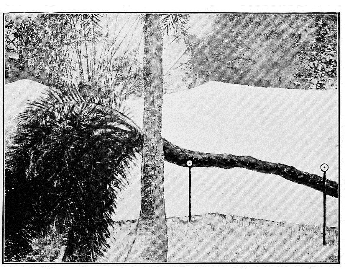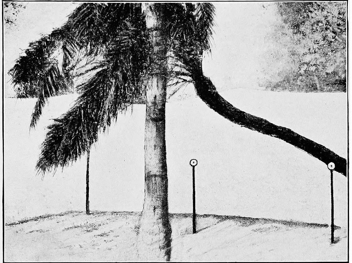 The Faridpur ‘Praying’ Palm: the upper photograph shows the position in the morning; the lower position in the afternoon. The two fixed stakes are one meter in height. In front is seen the erect trunk of a different Palm.