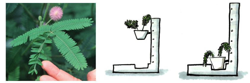 Mimosa Pudica leaves show sensitivity to touch by folding their leaflets. (Photograph by Alamy Blickwinkel) Illustrations of Gagliano’s experimental setup (Krulwich, 2015)
