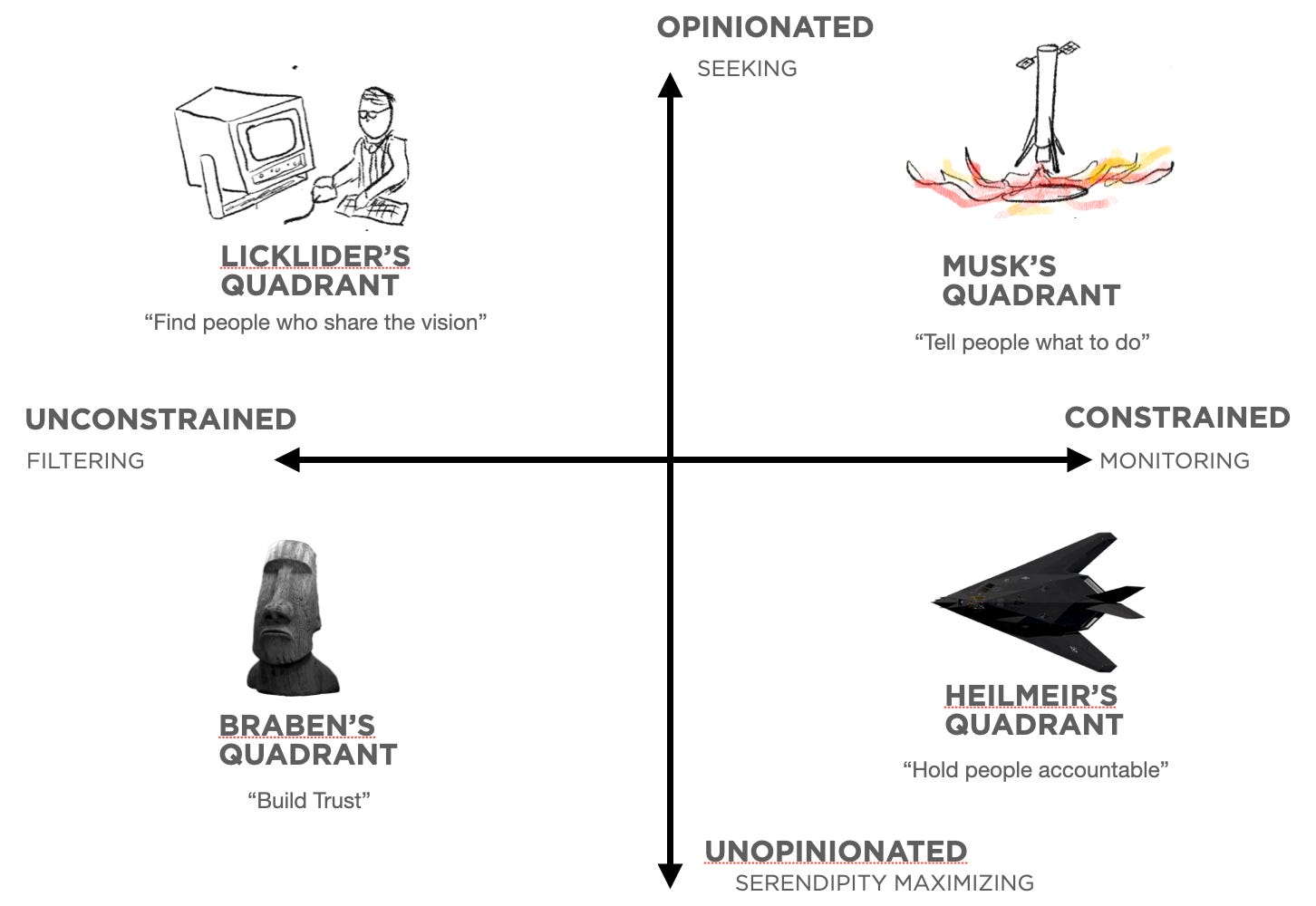 Together, the research management styles of Braben, Musk, Licklider, and Heilmeier form the four quadrants of a 2x2. Each of them managed research to great success: there are Nobel prizes and iconic technologies that would not have existed without each of them. Yet, their management styles are diametrically opposed. From this, I feel compelled to conclude that each of their approaches are effective for different flavors of research and different sorts of work. Enabling diverse flavors of research – from deep curiosity-driven explorations of how the world works to coordinated systems research – depends on diverse research management approaches and, by extension, diverse approaches and levels of involvement from funding organizations. This conclusion is painfully abstract and incomplete. It raises much more important questions like: