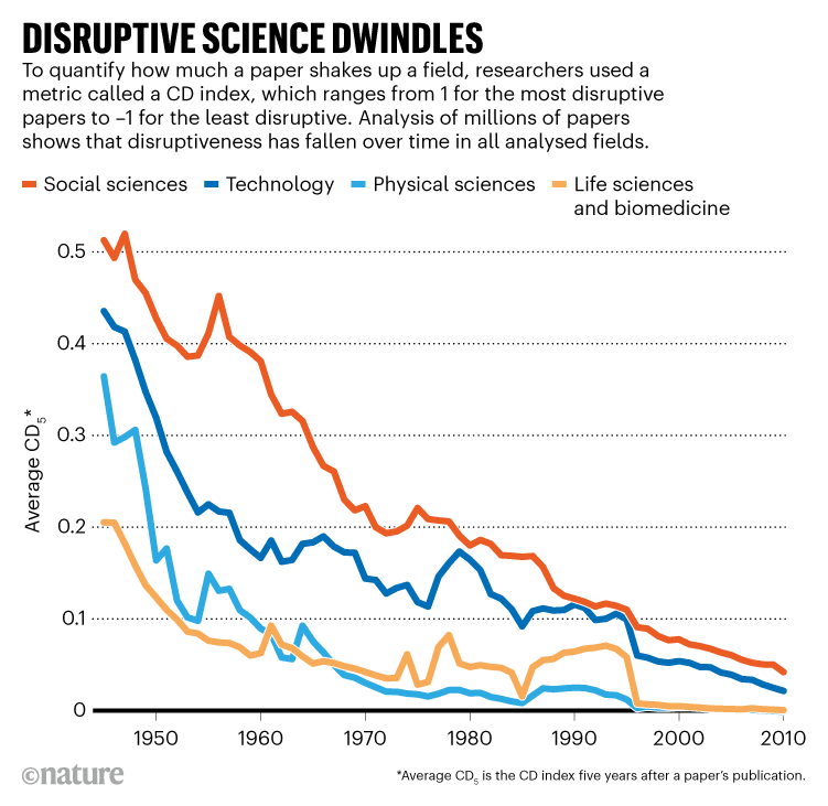 There are other analyses saying similar things about the slowdown of science, but Noah Smith argued (persuasively, to me) that this paper’s metric likely just measures changing norms around citation.