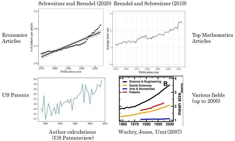 Relatedly, more journal articles and patents are being written in larger teams. Larger teams are a response to an increasing burden of knowledge as researchers specialize in narrower topics to get to the frontier of knowledge faster and then collaborate to combine all the necessary elements for a new expansion.