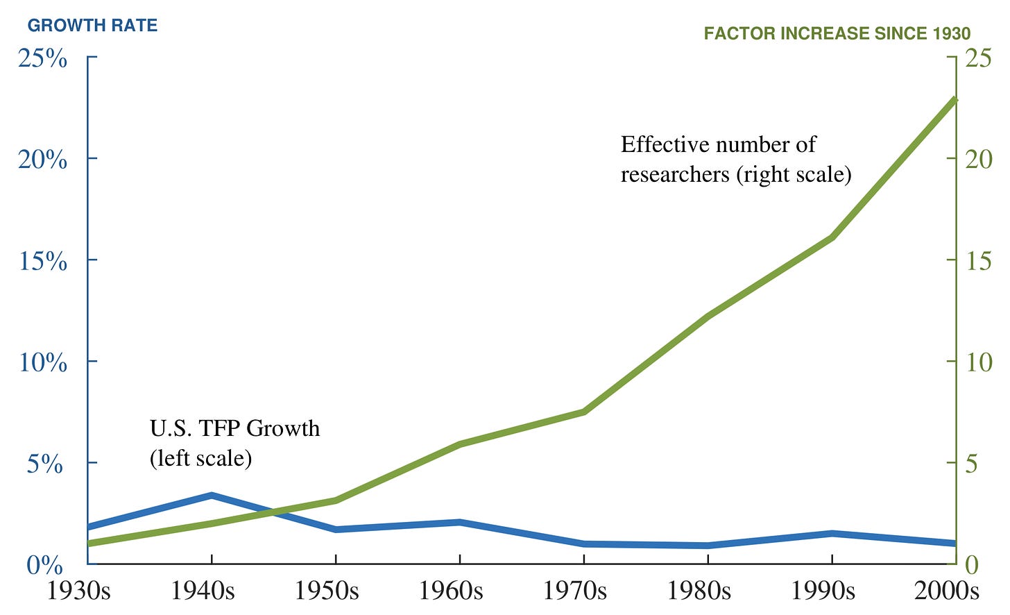 Several posts back I wrote about the 2020 paper “Are Ideas Getting Harder To Find?” by Nicholas Bloom, Charles Jones, John Van Reenen, and Michael Webb. In the post, I explain the paper with a metaphor: Our economy is like a car. Jones et al point out that our fuel use (R&D investment) has been growing fast for 100 years but our acceleration (productivity growth rate) hasn’t budged. They explain this by positing some inherent drag on idea exploration that gets more burdensome as we learn more. Something like inertia which makes it harder to double the speed of a car that’s already going fast than a car that starts slower.
