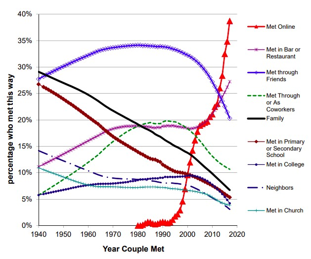 The internet is a sorting mechanism. Most people are familiar with the chart showing how people meeting their partners online has increased exponentially over the last decade. However, this is hardly the only sorting effect the internet has had, it is perhaps just the easiest to measure. As people move more of their lives and personalities online, the physical world and its governing institutions will increasingly reflect those emerging identities.