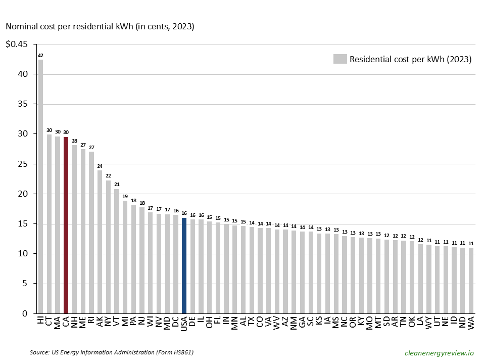 In fact, California now has some of the highest residential electricity prices in the country (highlighted in red below).