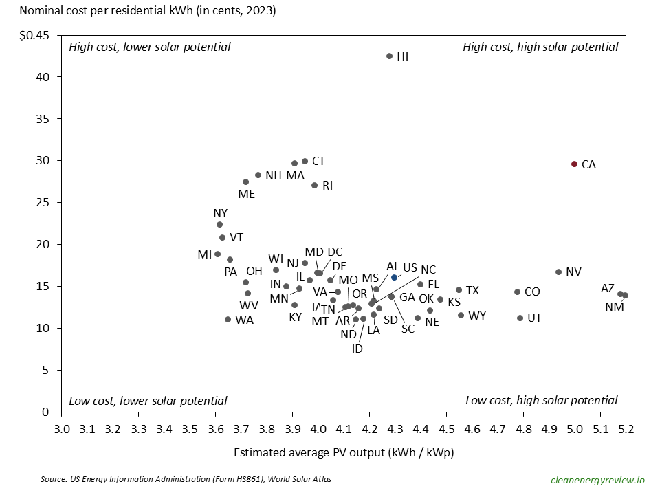 Taken together, we see that California has a unique combination good solar resources (high solar irradiance, shorter stretches of cloudy days) and high electricity costs that make it a prime target for grid defection