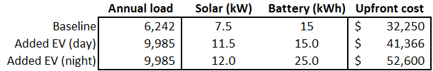Finally, a single EV adds a lot of load above our baseline, and the timing of its charging is pretty important to the overall system design. While charging at night is fine for grid-connected EVs, charging during the day (while the sun is shining) is much more efficient for our off-grid system. This makes specific customer behavior important to the final decision on defection.