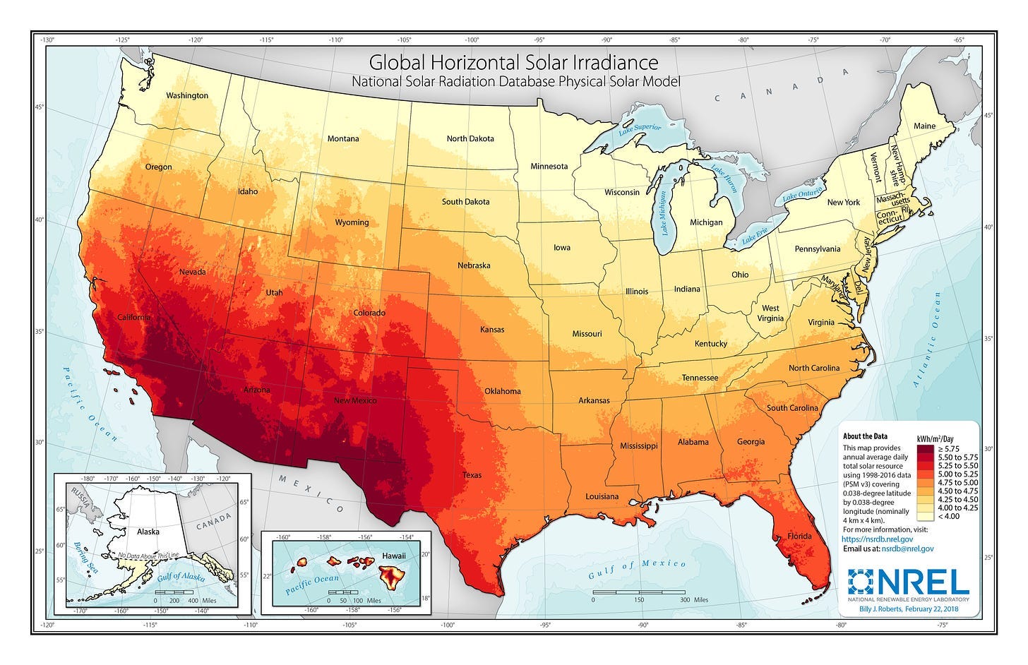 At the same time, California is rich in solar resources. In the below map—which shows solar irradiance that reaches a horizontal surface from direct, refracted, and reflected light—California is at the left end of what is effectively a solar bullseye in the US southwest. In the red areas, more output is possible from a given set of solar panels.