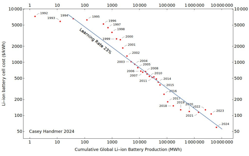 I’m most confident in the coming battery price declines. $600 per kWh is what you’d pay for the battery in a new Tesla Model 3 (and you’d get the car for free10). Cell prices for lithium iron (LFP) batteries are approaching $50 per kWh; installed battery prices are going to come down.