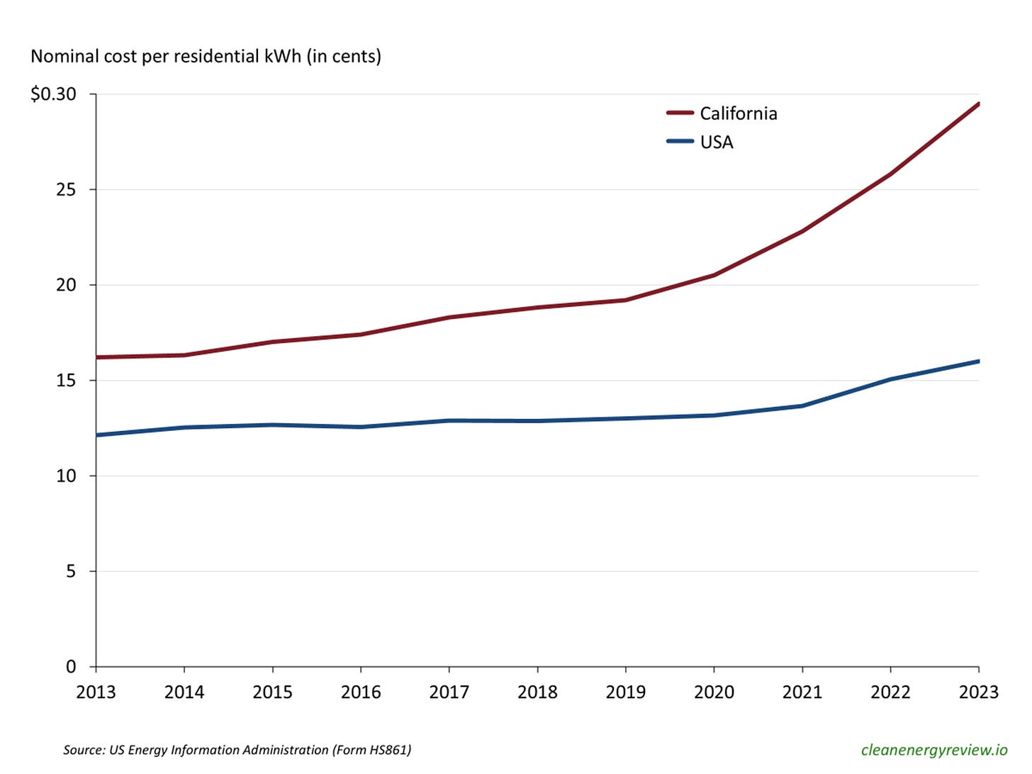 While solar costs are going down, residential electricity prices have been going up, particularly in California.