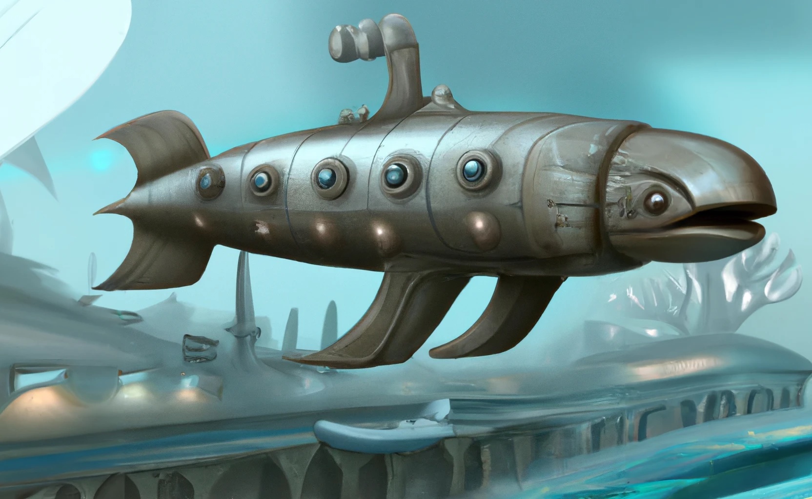 fish submarine chimera with metal body and fins sticking out the side DALL-E