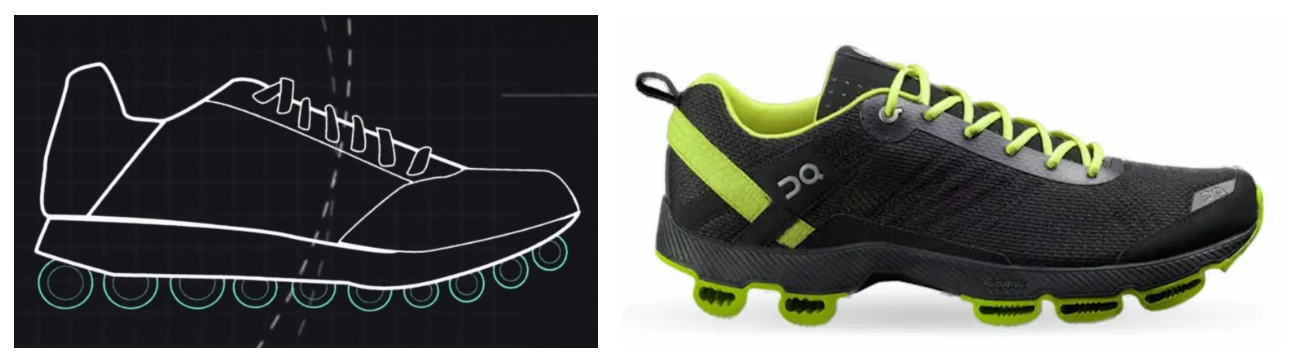 In the late 2000s Olivier Bernhard, the Swiss brainchild of On Running, was searching for a better running shoe. An engineer had finally persuaded him to try a radical design: a sole made from cut garden hose tubes. Bernhard was skeptical but felt the surprisingly value of cushioning and bounce from running in these. On Running was born from this idea as a new way to cushion running shoes. They designed novel geometries using existing synthetic materials like EVA (ethylene vinyl acetate) in their soles.
