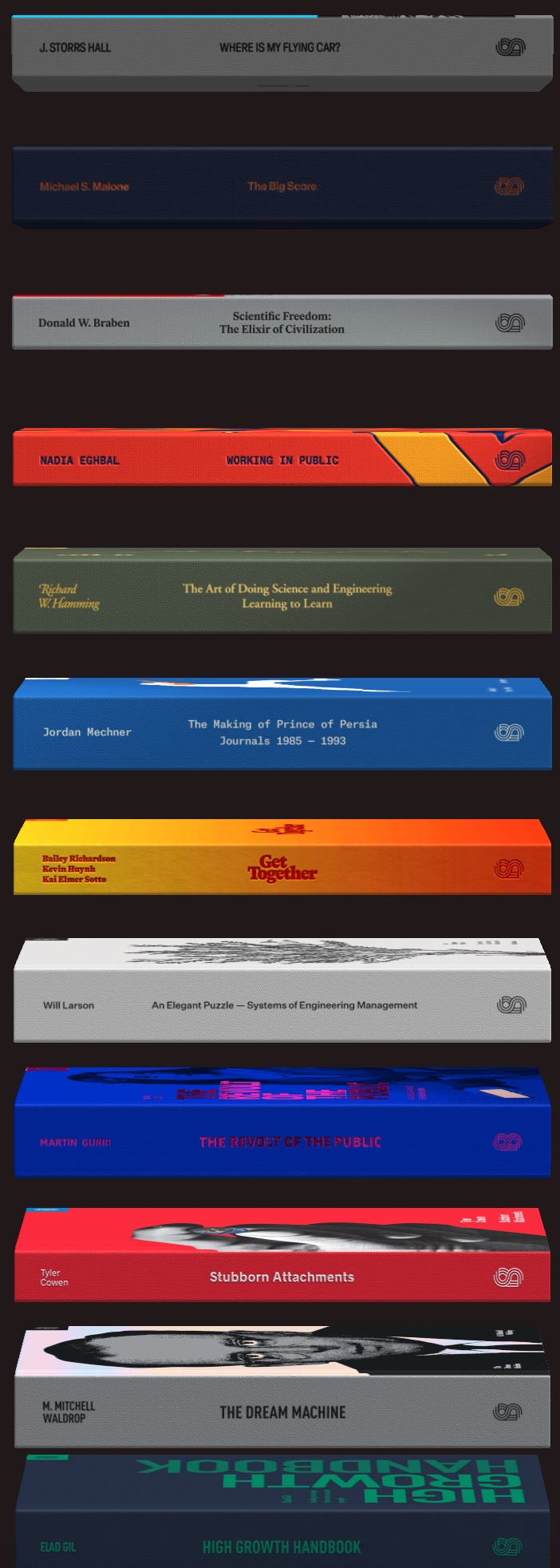 “It all began with an essay by Tyler Cowen and Patrick Collison — the Stripe guy — back in… 2019, I think. Since then there’s been a lot of people trying to organize this into a coherent movement. I think the idea machine is starting to run at full throttle about now. Would you like some books?”