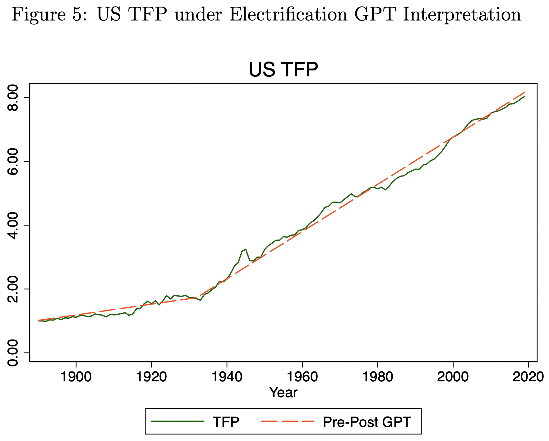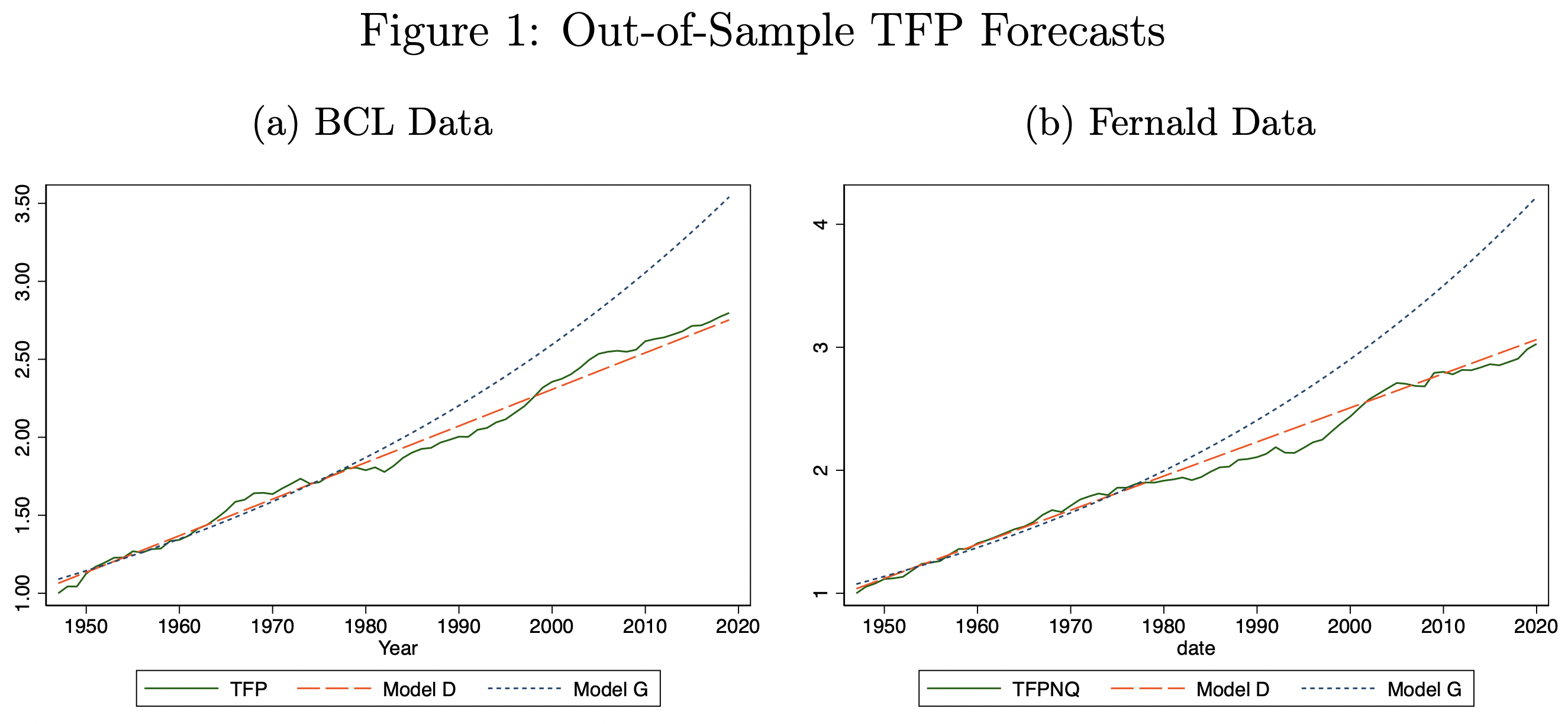 Over longer periods of time, however, a pure linear model doesn’t work. TFP, and GDP, clearly grow faster than linear over long periods: